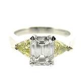 Platinum ring set with emerald cut diamond and 2 natural fancy yellow trillian cut diamonds Platinum ring set with emerald cut diamond and 2 natural fancy yellow trillian cut diamonds